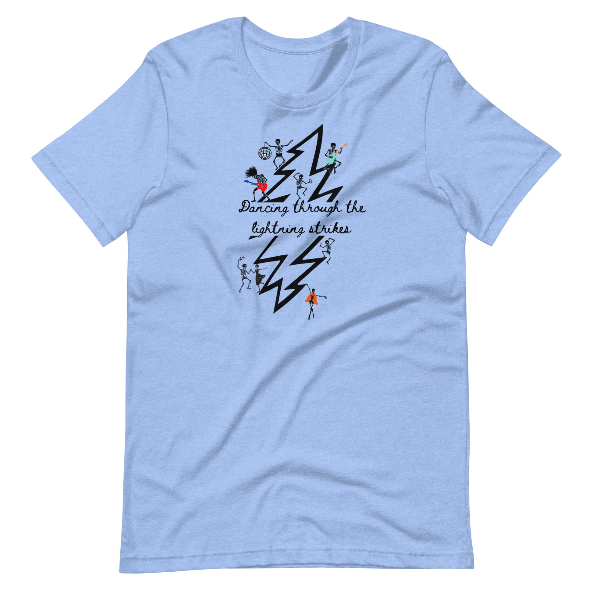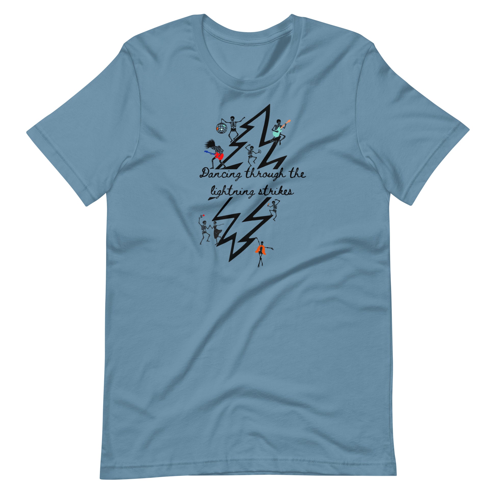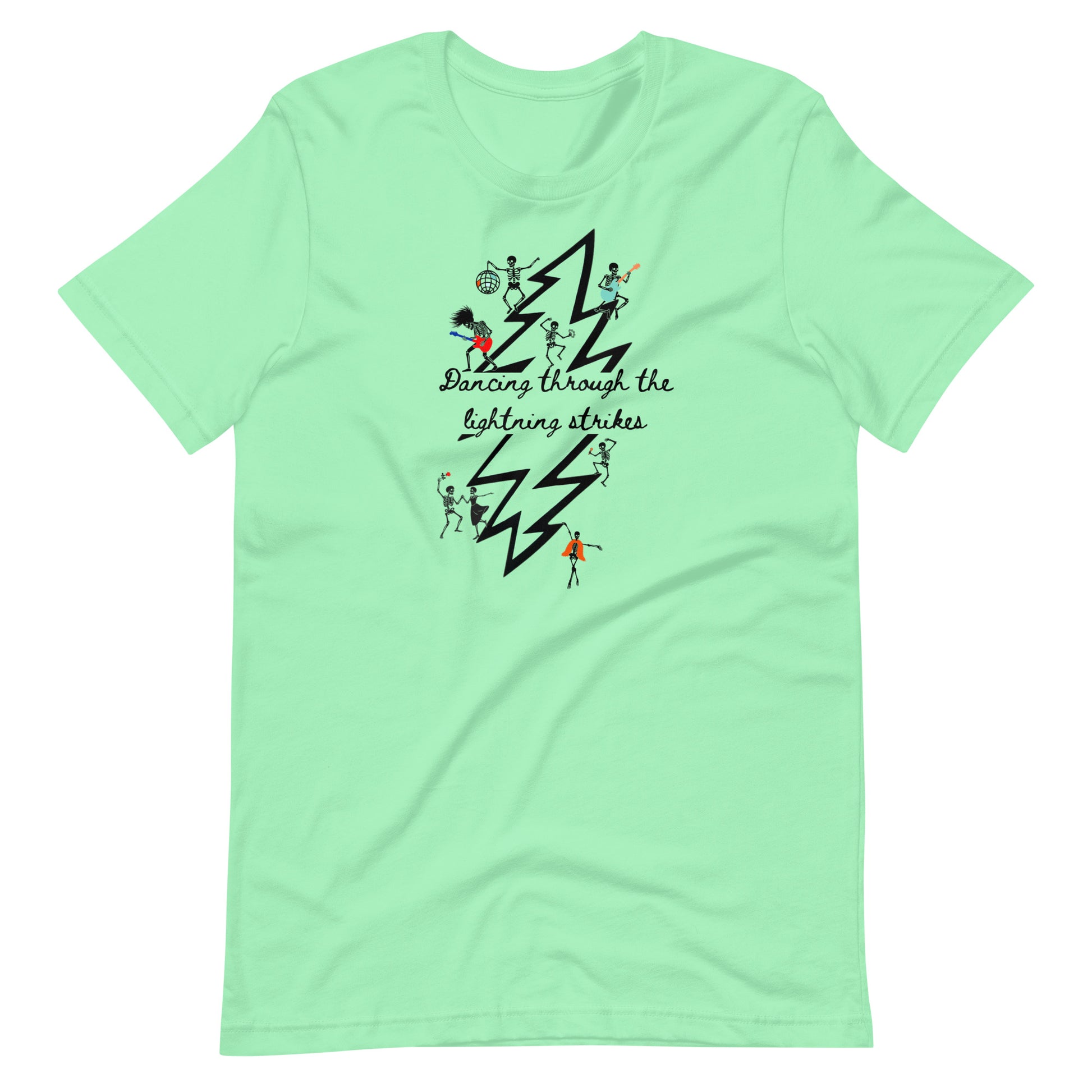 This shirt is for all the Grateful Dead and Taylor Swift fans that are loving her latest era, The Life of a Showgirl. The shirt features the lyrics "Dancing through the lightning strikes" from Opalite with skeletons literally dancing through the Dead bolt.
