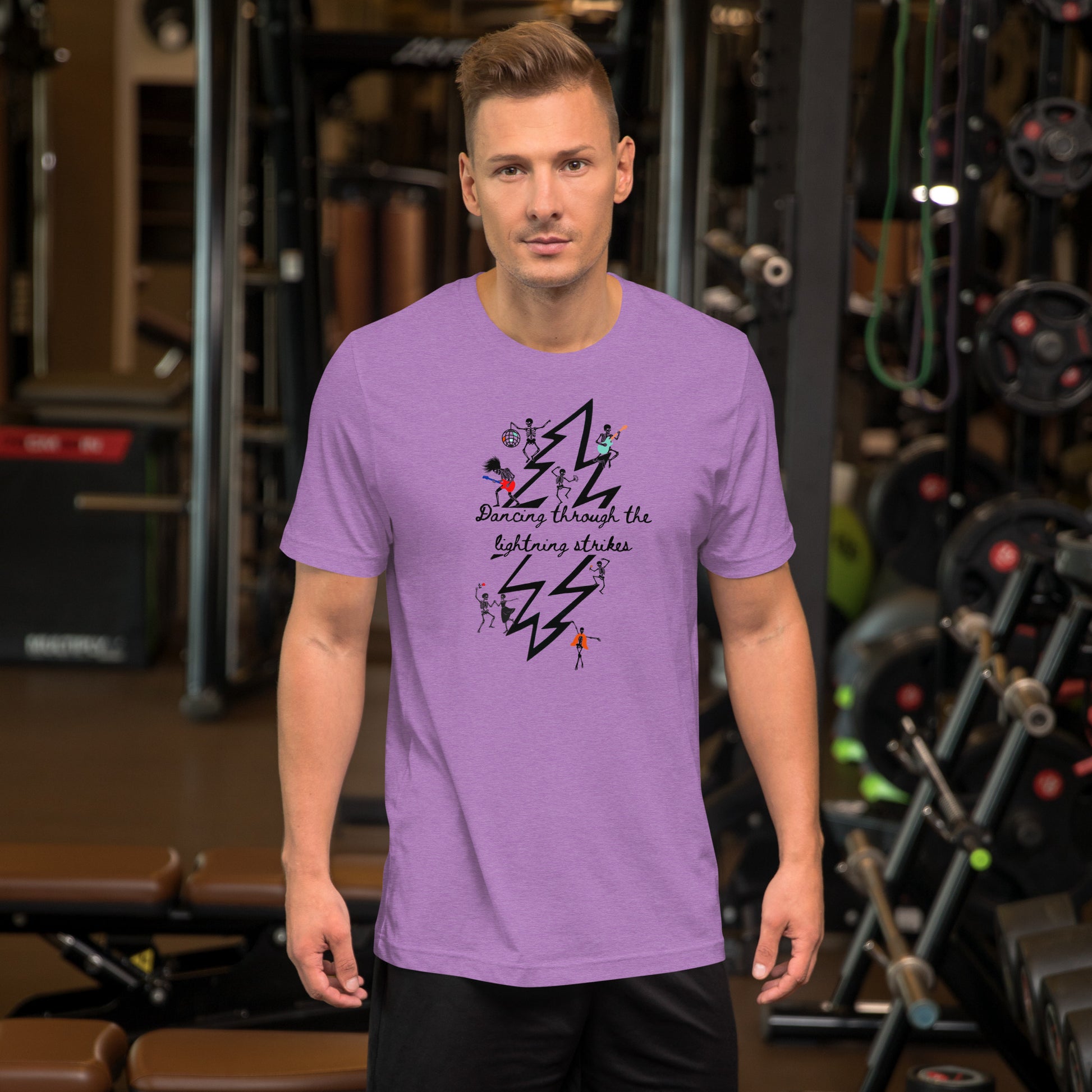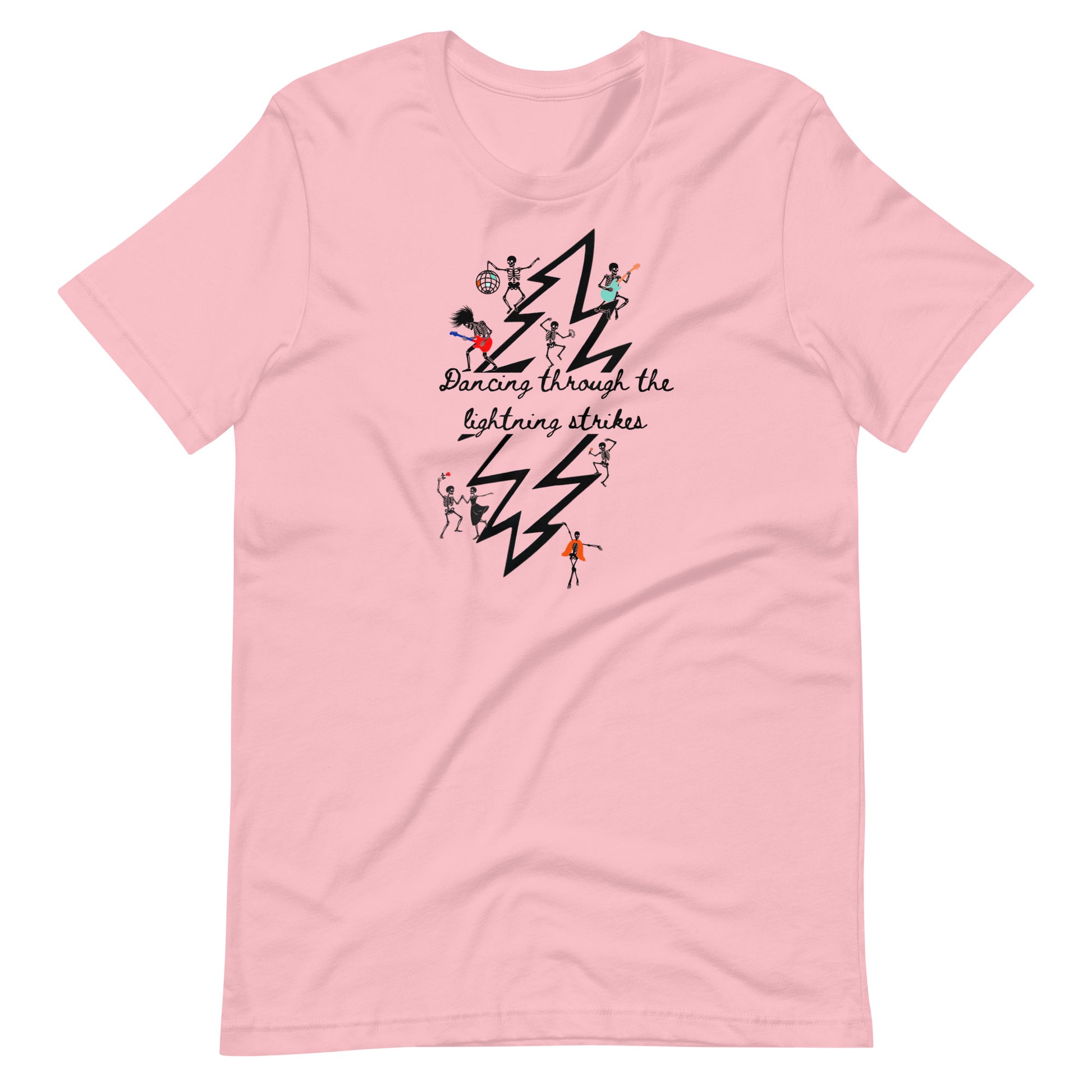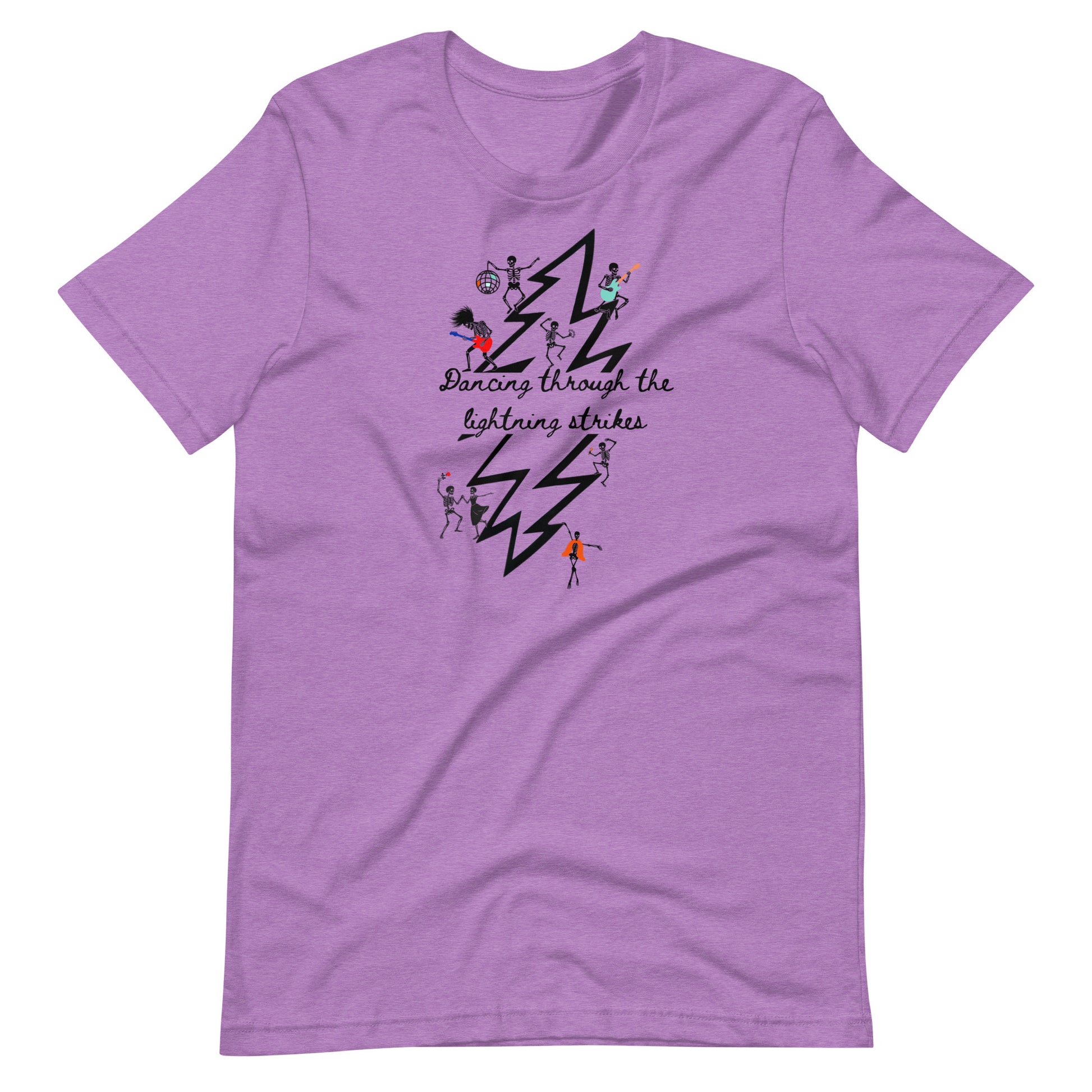 This shirt is for all the Grateful Dead and Taylor Swift fans that are loving her latest era, The Life of a Showgirl. The shirt features the lyrics "Dancing through the lightning strikes" from Opalite with skeletons literally dancing through the Dead bolt.